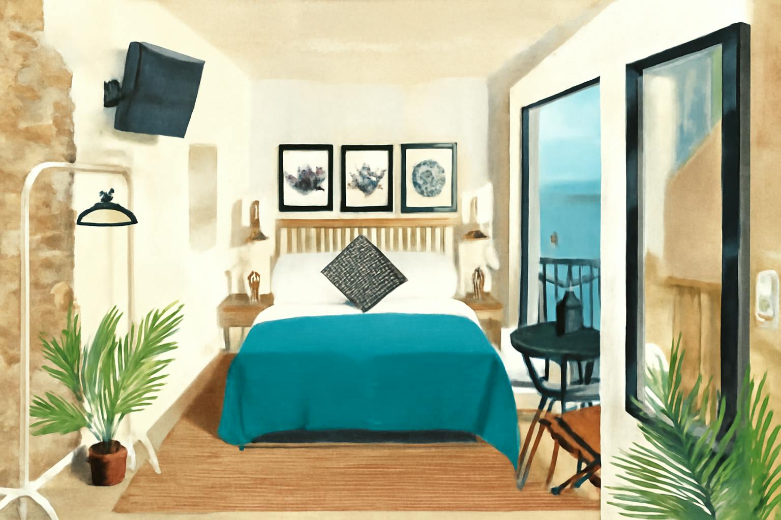 Esta habitación luminosa del primer piso te ofrece un balcón con vistas al mar. Perfecta para quienes buscan una experiencia elevada, pero sin alejarse del ambiente vibrante de Peñíscola. Con una decoración contemporánea, esta habitación es ideal para quienes desean disfrutar de las vistas sin renunciar a la comodidad de un acceso fácil.
