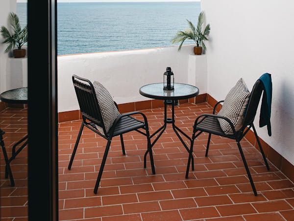 A bright and elegant room with a private balcony overlooking the sea. Ideal for enjoying the Mediterranean experience from an elevated view—feel the breeze from your room or sip coffee in the sun.